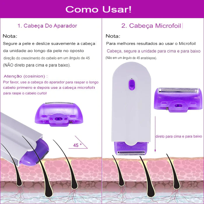 O DEPILADOR PORTÁTIL É UM DEPILADOR COM LAMINA DE MICROFOIL QUE REMOVE OS PELOS DIRETAMENTE NA RAIZ DE UMA FORMA SIMPLES, RÁPIDA, SEM MANCHAR OU ESCURECER A REGIÃO DA SUA PELE.