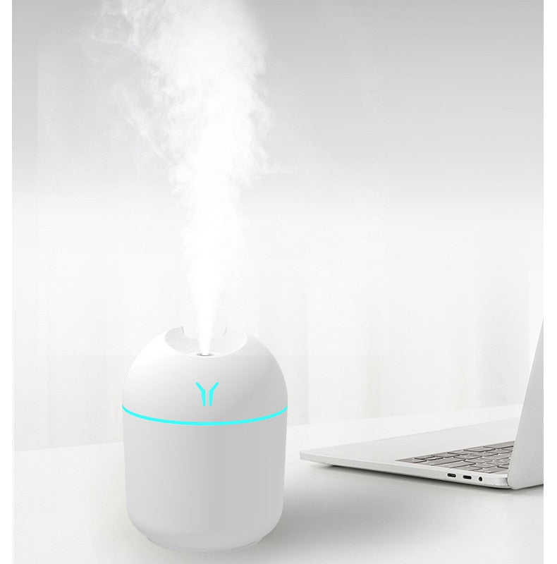 Possui luz de led, desligamento automático em caso de falta de água, alimentação por USB e funcionamento ultra sônico, formando uma névoa a partir da vibração da água sem a necessidade de produzir calor.